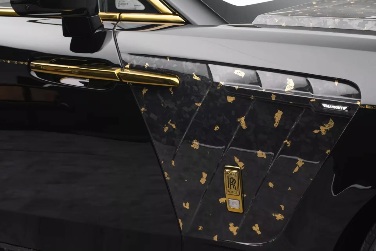 The Rolls-Royce Spectre is supposed to glide around in near silence, but Mansory decided that simply would not do. Its latest take on the electric coupe, part of the Spectre “Equista” program and shown here in the over-the-top Linea d’Oro spec, adds a wide-body carbon kit, 24-inch wheels, gold detailing and, most notably, external speakers tucked under the rear bumper that blast fake combustion-engine noises to the outside world.