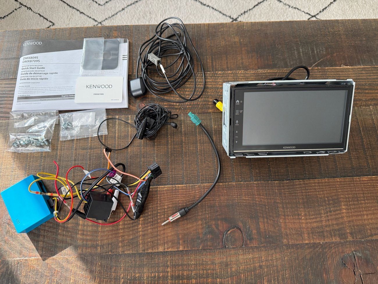 1. Kenwood DMX8709S double DIN receiver with wireless Apple CarPlay and Android Auto in like new condition. Installed in my car for a little over a year and a half with minimal miles put on the car during that time. 6.8″ WVGA Display, 3 sets of 4 volts preamp outputs, XM ready, rear USB input, wired microphone for Bluetooth calls, backup camera ready. Includes original box, all paperwork and all original mounting hardware, the MOST fiber optic decoder box for Bose cars, the antenna converter and a Metra wiring harness that allows this to connect right up to most factory 9×7 cars with Bose. Everything is wired up so you would just need to connect to a switched power source and a lights source. Also includes 2 mounting kits – one for a .1 car with volcano grey trim and one for a .2 car with black trim. Asking $375 for everything with local pickup preferred.