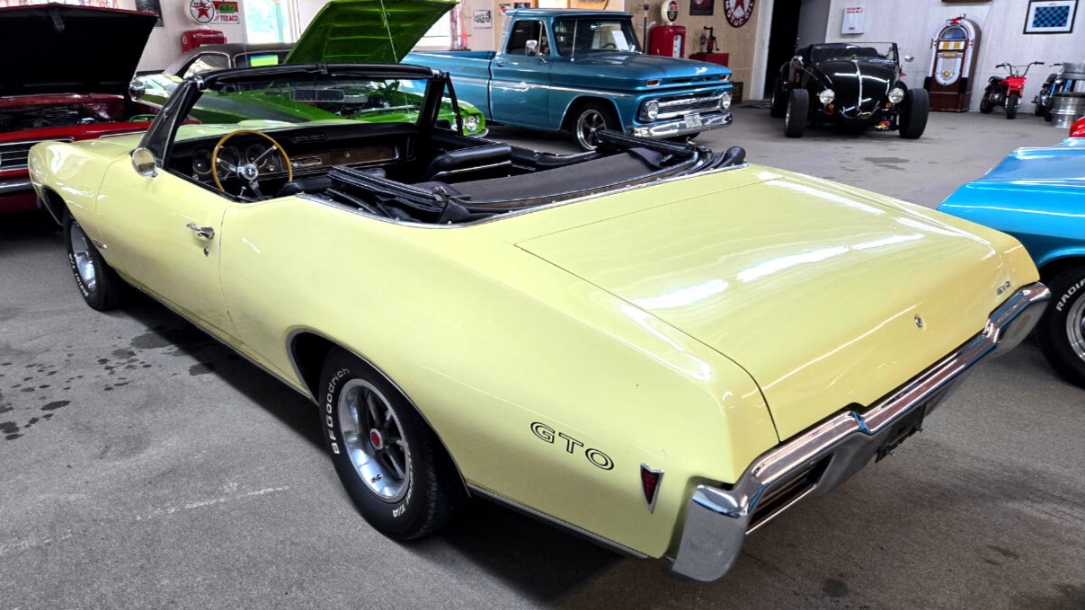 The light yellow exterior features a body-color nose, dual hood scoops, GTO badging, driver-side mirror, newer power-operated black convertible top, chrome rear bumper, and dual exhaust outlets.