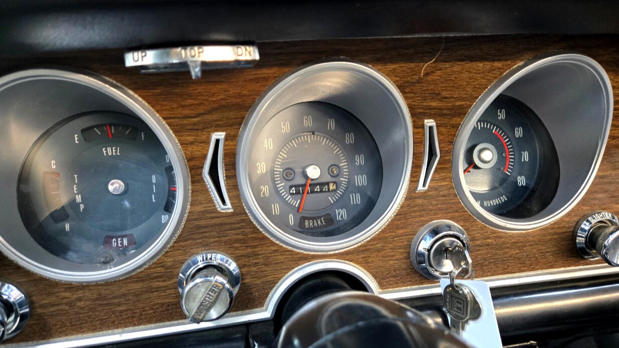 Woodgrain trim surrounds the instruments, which include a 120-mph speedometer, 8,000-rpm tachometer, and gauges for the temperature, oil pressure, and fuel level. The odometer shows 41,144 miles, but this vehicle’s title indicates that it’s mileage-exempt.