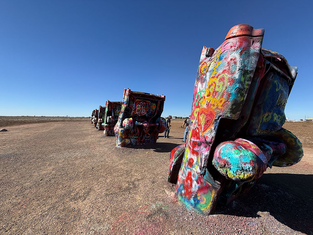 The rest of the trip would see glorious sunlight! Cadillac Ranch provided the chance to add fresh paint to the constantly evolving row of half-buried Cadillacs. From there, the official halfway point of Route 66 in Adrian, Texas marked the transition from “we’re on a road trip” to “we’re really out here now.”