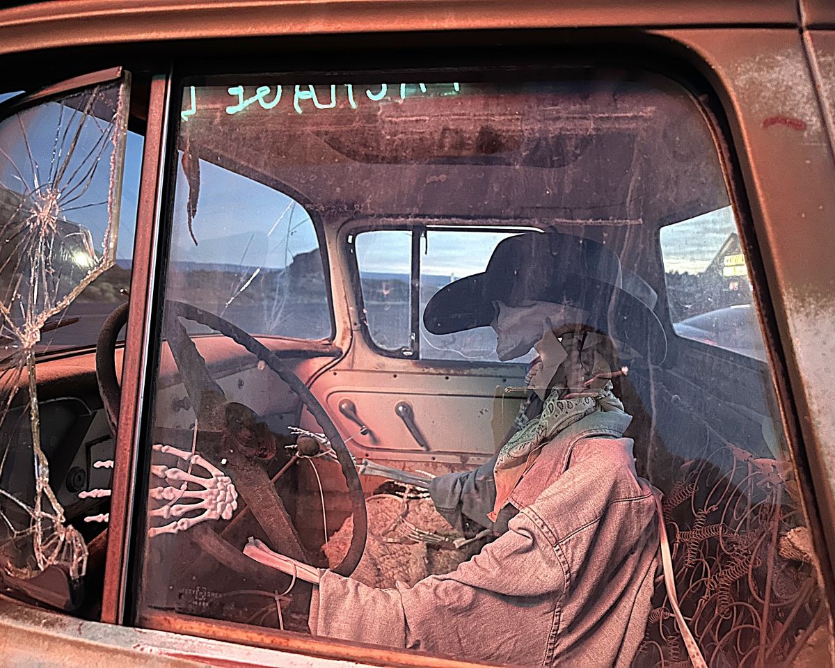 During my five-hour drive from Phoenix to Fredonia, I had worked up an appetite, so I decided to hit up a local favorite: Buckskin Tavern. It was located a few miles up the road, just a bit shy of the Utah state line. Greeting visitors near the neon Buckskin sign out front was a 1955 Chevrolet 3200 pickup, complete with a skeleton sitting in the driver seat and a Christmas tree in the bed. While showing its fair share of patina, the truck had a relatively straight body from what I could tell in the dim lighting.