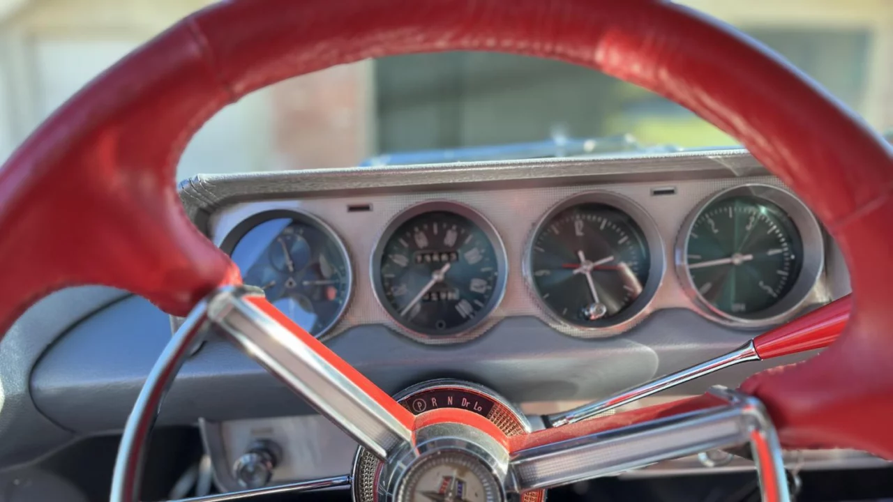 The cabin is furnished with gray and red leather, with the front bench being power-operated. Features include factory air conditioning, power steering, power windows, column-mounted transmission shifter, aftermarket AM/FM/auxiliary stereo nicely tucked away, and custom cup holders.