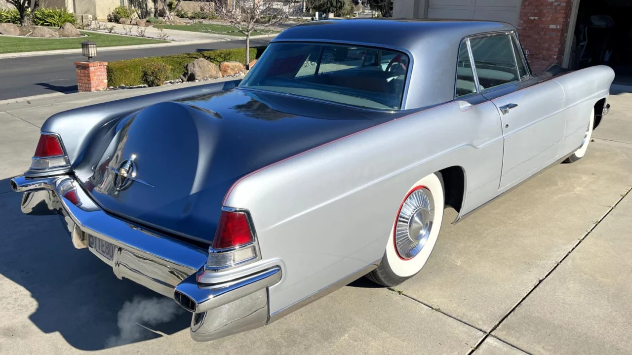 Currently offered for sale on AutoHunter is this 1956 Continental Mark II. Ford Motor Company created a new division for 1956—Continental, placed a notch above Lincoln—specifically for the revival of the Mark series, and it was priced several thousand dollars over typical Lincoln offerings. This one has received mild customization, mainly seen in the exterior paint and interior. Power comes from a 365ci “Y-block” V8 paired with a three-speed Turbo-Drive automatic transmission. Features include power windows, power front disc brakes, air conditioning, power seat, aftermarket stereo, and more. Painted in two-tone silver and gray metallic over a gray and red leather interior, this ultra-luxury cruiser is offered by the selling dealer in California with upholstered tool bags and a clear title.
