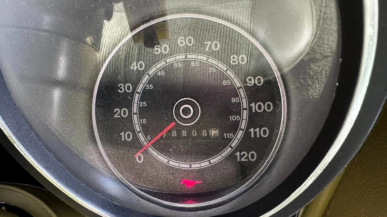 Instrumentation consists of a 120-mph speedometer, fuel gauge, and warning lights for the oil pressure, temperature, alternator, and brakes. The odometer shows 78,806 miles, which is this car’s true mileage, according to the selling dealer.