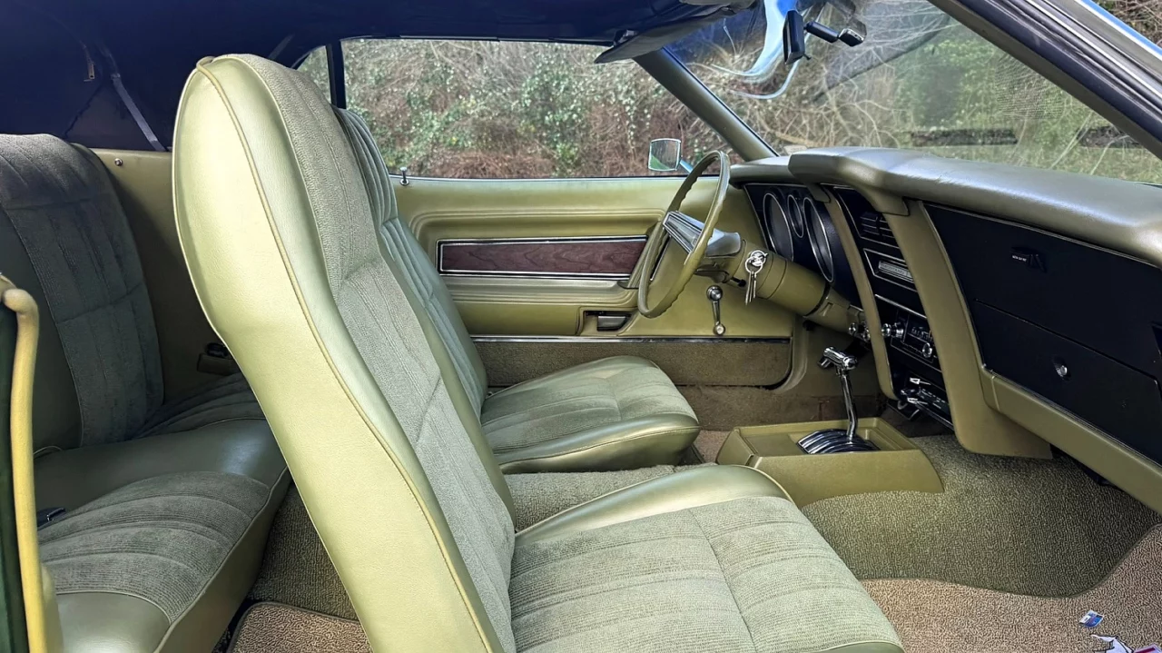 If this car’s green paint caught your eye, we have great news: the knitted vinyl upholstery is green, too—Avacado green, to be exact. Cabin features include manual steering, front bucket seats, factory air conditioning and AM radio, and automatic shifter with consolette.