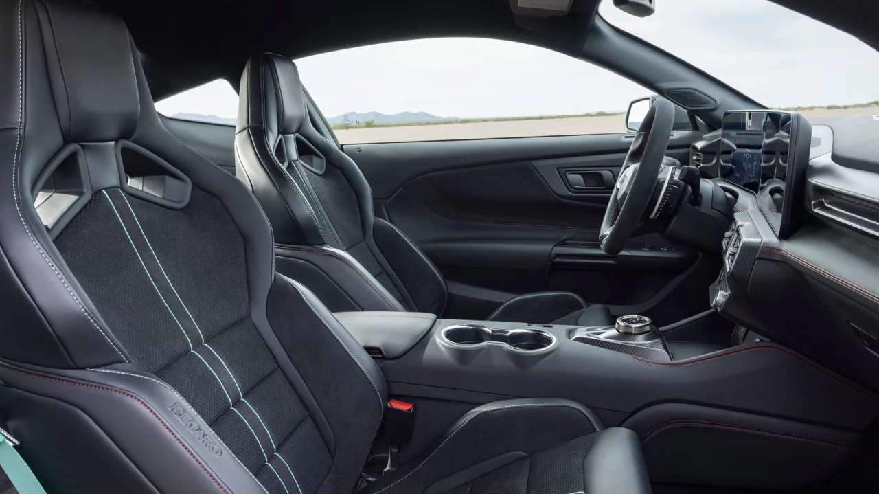 According to Ford, “During development, our team engineered a specific ducktail-shaped decklid for the Mustang Dark Horse SC Track Pack that improved the rear wing’s efficiency by 10 percent without requiring a larger wing or higher angle of attack, both of which could impact rear visibility.” At 180 mph, the carbon fiber wing pushes the back end closer to the track with 620 pounds of downforce. Inside, SCs with the Track Pack receive Recaro leather and Dinamica sport seats, plus Space Gray or Teal accents; there is no rear seat—only a storage shelf.