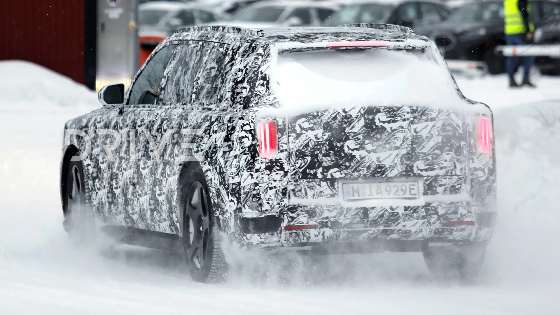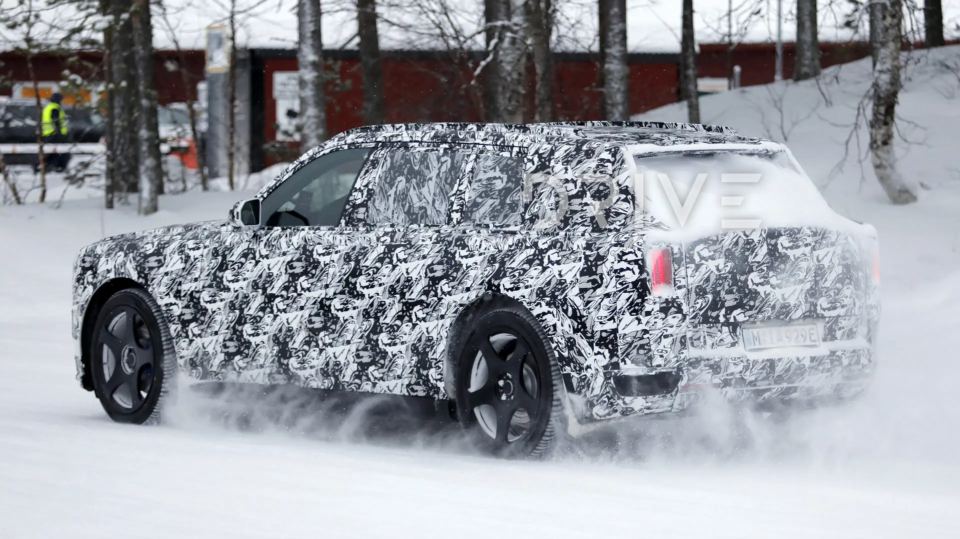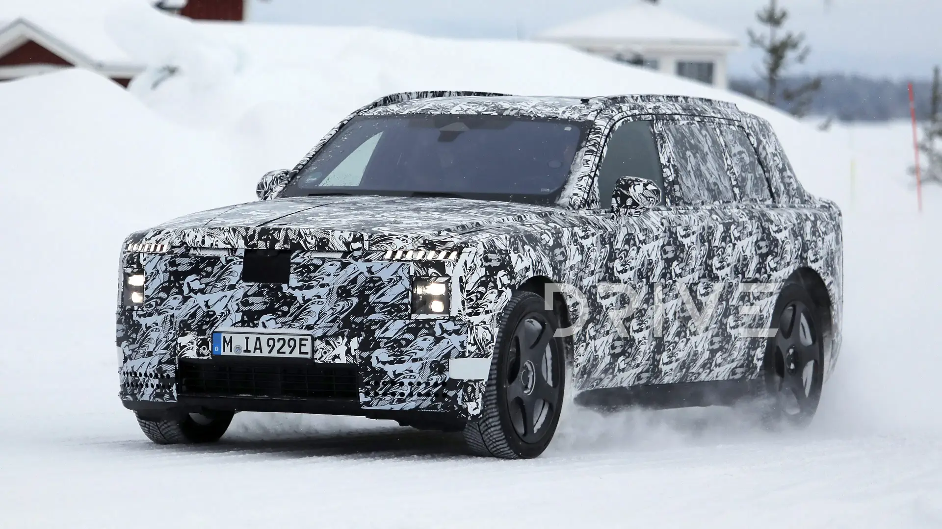 Wrapped in a camouflaged livery and tested in alpine conditions, the pre-production electric SUV shares similar proportions to the current petrol-powered Cullinan.