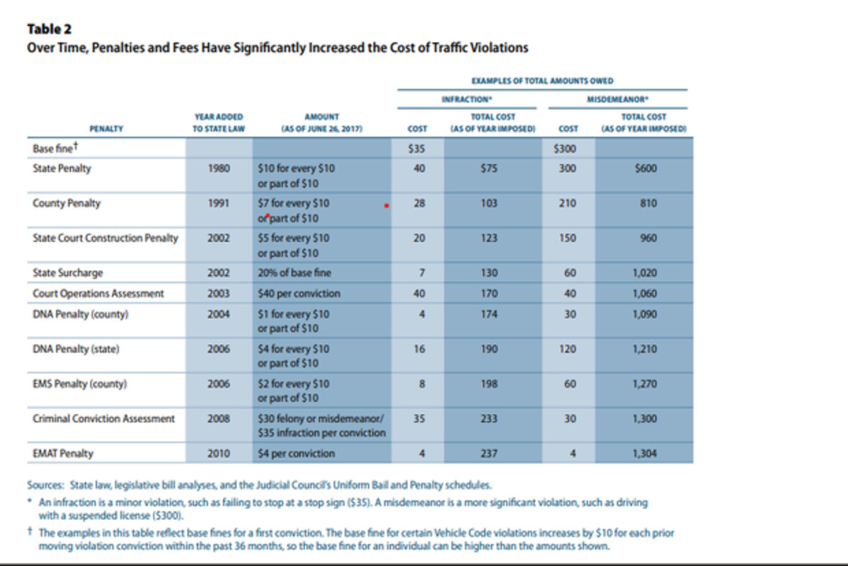 The report points to California State Auditor findings that the penalty structure has been built in a piecemeal way and that money from traffic penalties can flow into a wide mix of state and local funds, including programs that are not directly tied to road safety. The auditor also documented how a low base fine can balloon after assessments are added, and urged lawmakers to rethink the structure.