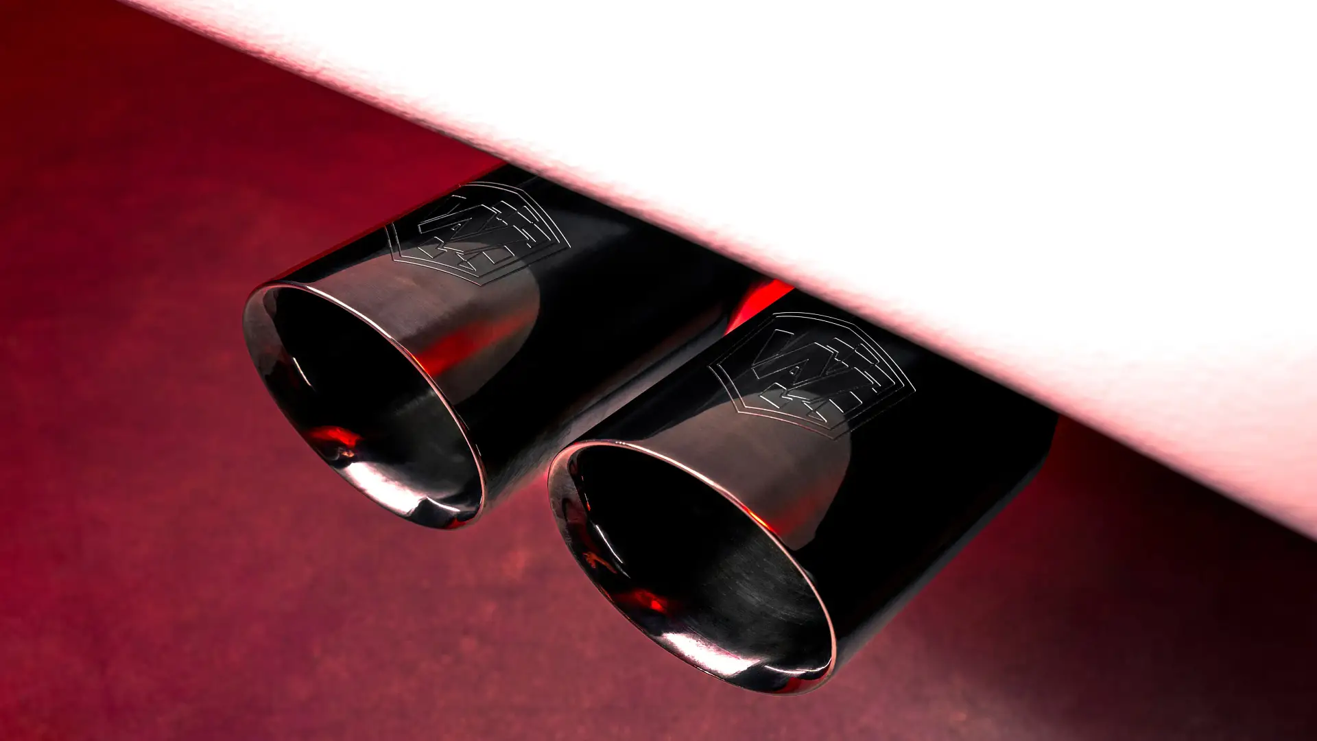 Other performance enhancements include dual exhaust pipes from the catalytic converter to twin side-exit outlets behind the rear-right wheel, which have not interfered with the full-size spare wheel.